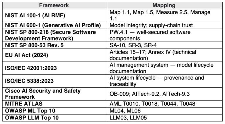 OWASP’s Top 10 for LLM Applications (2025) lists Supply Chain as LLM03, specifically calling out weak model provenance and noting that no guarantees on the origin of the model.  The MITRE ATLAS framework documents supply chain compromise (AML.T0010) as a primary initial-access technique. The Cisco AI Security and Safety Framework classifies third-party model components under OB-009 Supply Chain Compromise, with direct applicability through AITech-9.3 (Dependency/Plugin Compromise). The Cisco AI Security and Safety Framework classifies third-party model components under OB-009 Supply Chain Compromise, with direct applicability through AITech-9.3 Dependency / Plugin Compromise: actors insert malicious code, backdoors, or vulnerabilities into third-party dependencies used by models, agents, or AI applications, creating supply-chain attacks that affect all systems using the compromised component. Foundation-model checkpoints reused as initialization for downstream models are precisely such dependencies.