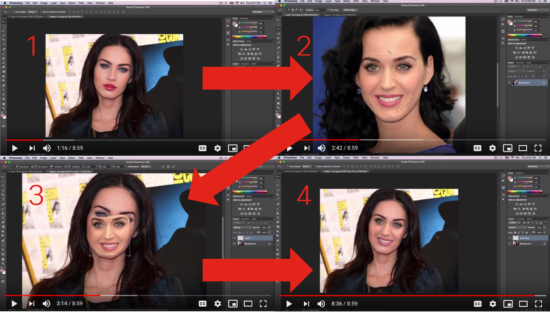 In the below example, Photoshop is used to overlay Katy Perry’s face onto Megan Fox’s (clothed) body: