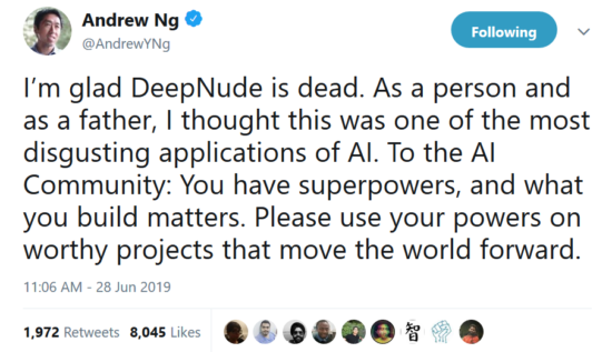 After 4 days on the market, the creator(s) of DeepNude, the AI that “undressed” women, retired the app following a glut of backlash from individuals including leaders of the AI community: