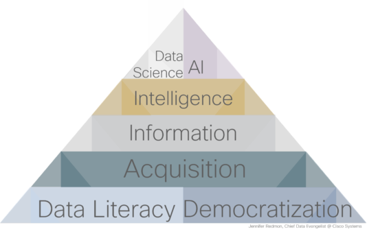 Intelligence, both business and data intelligence, should not be discounted in the era of Data Science. Intelligence separates correlation from causation, infuses meaningless data points with stories, and provides insights to leaders who make business decisions at all levels. When done correctly, it is a powerful force behind analytics-driven enterprises. However, when done incorrectly, it is also the level at which spurious correlations occur (such as the statistically significant increase in ice cream sales correlating with murder). As with the ice cream-murder real world example, success at this level depends on individuals who have a depth of understanding of how the data was created, its lineage, and how will be used.