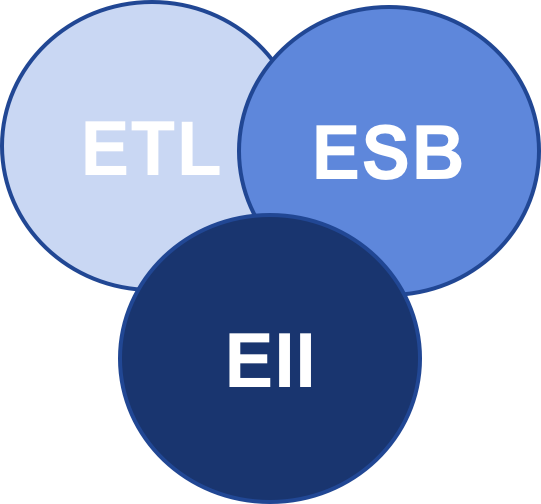 In the early 2000s the data management term Enterprise Information Integration (EII) came to the fore. EII was driven by advancements in high-performance query optimization that made data federation at enterprise scale possible for the first time. Wikipedia’s entry on EII claims the vendor Metamatrix, was the source of the term. And organizations such as TDWI and Gartner identified EII as an essential complement to Extract, Transform, and Load (ETL) and Enterprise Service Bus (ESB), often depicted by three intersecting circles as follows: