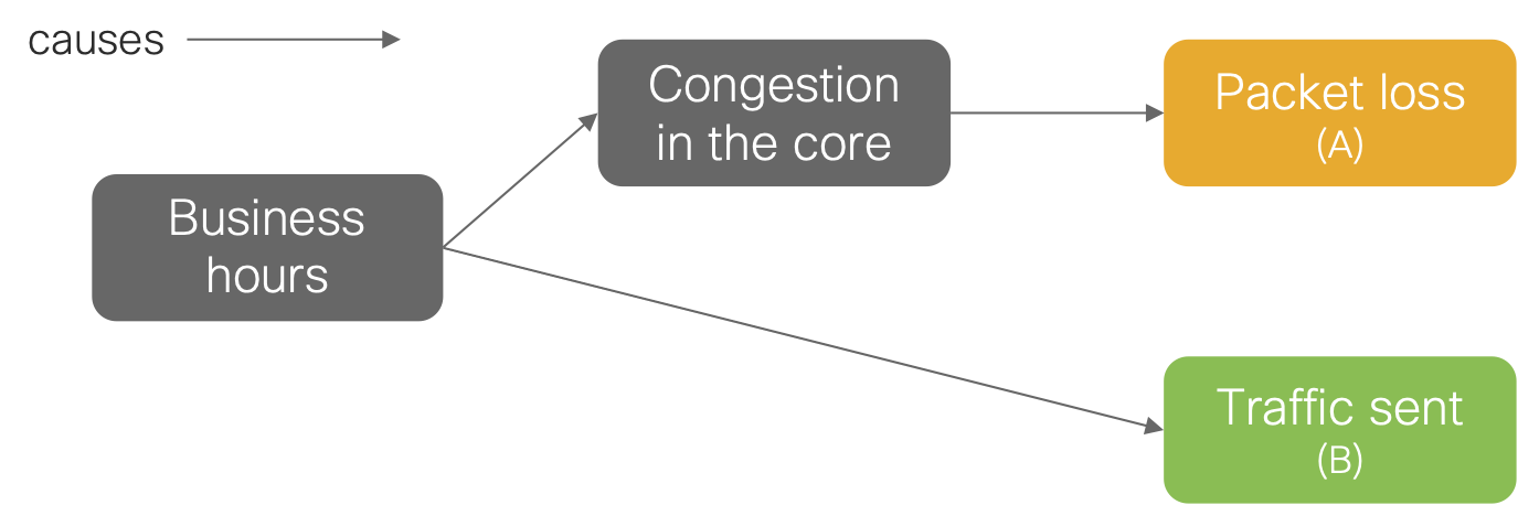 Situations like our train example happen all the time in the analysis of networking telemetry. For instance, you may correlate the packet loss measured along a given path across the internet with the amount of traffic that a router of your organization is sending along the said path. This correlation may be high and its p-value close to zero. Despite these seemingly conclusive statistical values, they do not imply that the traffic congestion is causing the packet loss. Indeed, the congestion might simply be the result of global internet traffic patterns, which coincidentally corresponds to the same temporal patterns as the traffic of your organization. This is because they have a common cause, a third variable, C: the congestion and associated packet loss are driven by increased internet traffic created during business hours- going up during working hours and then down during nights and weekends. We can summarize this knowledge with the following causal diagram: