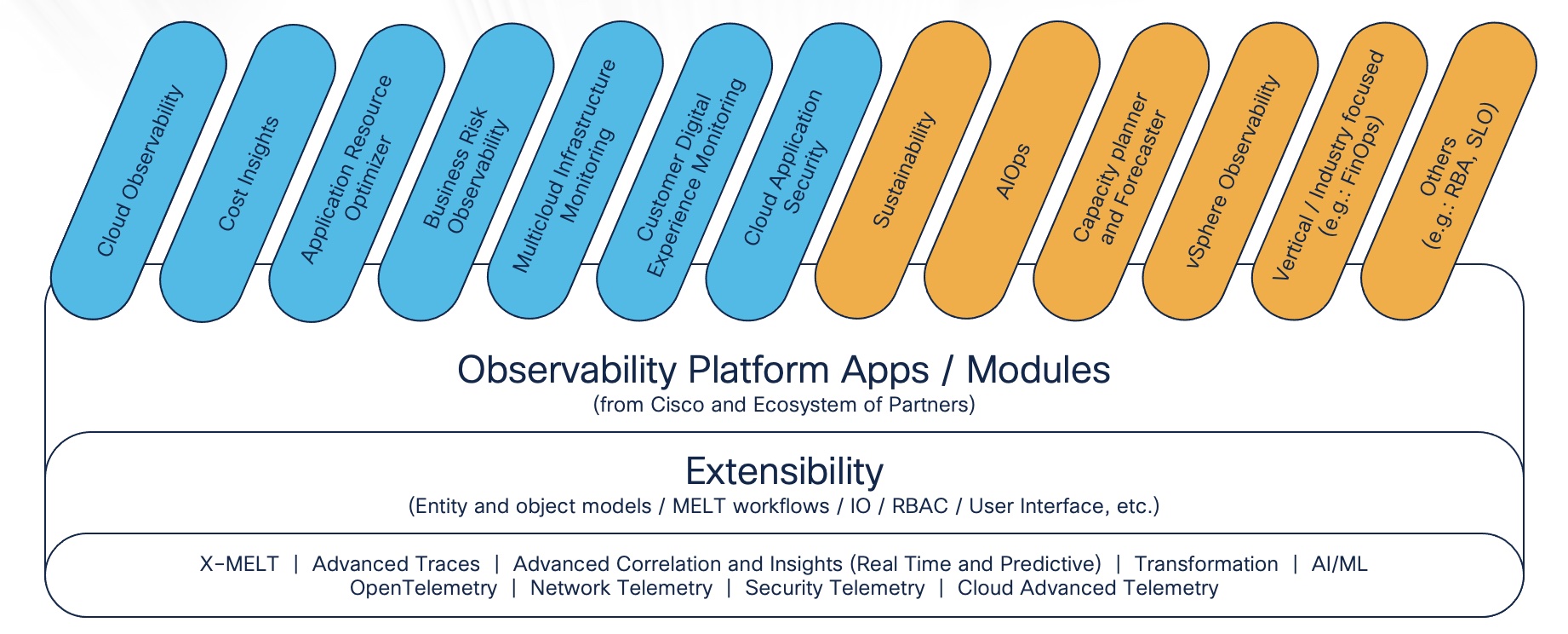 Cisco Observability Platform is an open and extensible, API-driven full stack observability (FSO) platform focused on OpenTelemetry and anchored on metrics, events, logs, and traces (MELT), providing AI/ML driven analytics as well as a new observability ecosystem delivering relevant and impactful business insights through new use-cases and extensions.