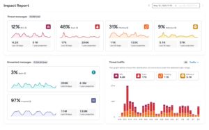 The Email Threat Defense impact report offers full visibility into AI-tracked threats, showing trends over time as well as further insights and analytics.