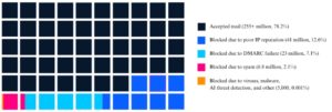 - 23,000,000 (7.05%) emails blocked for DMARC failures (Domain-based Message Authentication, Reporting, and Conformance)