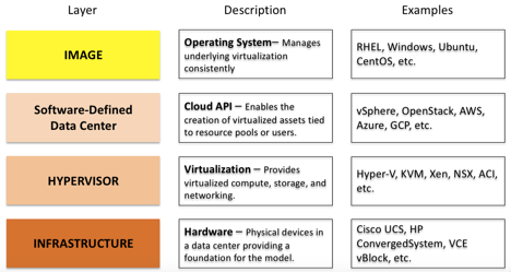 Here, a bias towards compute resources (as opposed to network or storage) becomes apparent as Image connotes use of particular operating systems and other pre-installed software components. Format can be an issue here as not all SDDCs support the same types of Images (.OVA vs .AMI, etc.), but most operating systems can be baked into different kinds of Images to run on each popular SDDC. Developers will sometimes get involved at this layer, but not nearly as much as the two layers yet to come.