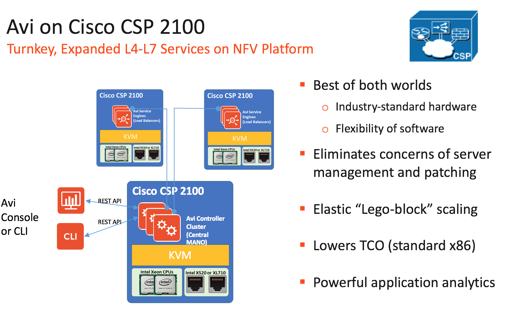 The CSP 2100 high-performance NFV platform is a foundational component of the Cisco’s Secure Agile Exchange (SAE) solution. SAE securely connects employees, customers, and partners to applications across private data centers, public IaaS clouds and/or public SaaS clouds. Over the last year Cisco and Avi Networks have partnered to deliver turn-key software load balancing services on the CSP 2100 for SAE as well as for basic load balancing use cases. Global Financial and Global Energy companies have already taken advantage of the joint solution to deliver elastic and cost-effective load balancing as a virtual network function (VNF) on the CSP 2100 platform. These enterprises have used the solution to gain flexibility and automation replacing legacy purpose-built hardware load balancers. Avi is only one of several VNFs running on the CSP 2100 at these customers.