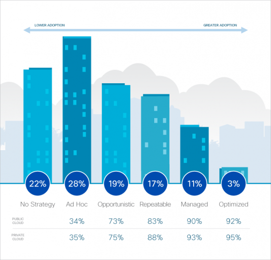IDC categorizes the maturity spectrum of cloud adopting organizations from ad-hoc (beginning awareness and immediacy to adopt) to optimized (mature and delivering IT-enabled products and services). IDC cited, that as companies execute their cloud strategy and move along the cloud adoption curve from ad-hoc to optimized, they see greater benefits and are able to more strategically allocate their IT budgets to innovation.