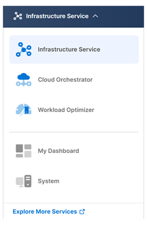 To easily access Intersight’s services, the new UI introduces a multi-service selector. From the selector, users can choose: