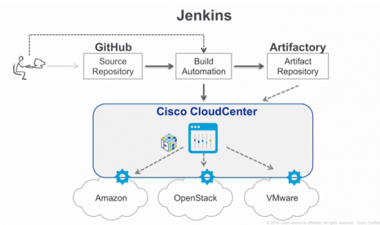 You can see DevOps in action: If you are a developer who has put together a Dockerized application, sooner or later you will want to test it or deploy it in a production environment. And you can deploy the application via CloudCenter on Cisco Metacloud and test any changes in production …. basically without leaving your integrated development environment. For example, after you check the code into GitHub, a Jenkins build process can be triggered. The build process invokes the application profile deployment and injects the latest successful build artifact in CloudCenter. Subsequently, the code is deployed to the test environment, which in this case resides on Metacloud. The developer will then be notified that the new code has been deployed.