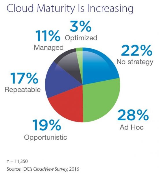 According to an IDC study, there are five maturity levels of cloud adoption and, even though cloud is being highly adopted with more than 80% of worldwide organizations adopting multiple clouds, only as little as 3% of organizations have an optimized cloud strategy. When organizations achieve an optimized cloud strategy though, there are certain key performance indicators that are associated with better business outcomes. Some of the KPI’s that IDC found are, a 77% of IT cost reduction, 72% ability to meet SLA’s, 200% of strategic allocation of IT budget and even 11% of revenue growth.