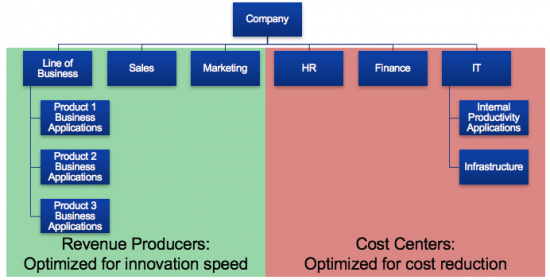 But not all organizations within this structure are created equal. On the left, functions like the product teams, sales, and marketing are profit and loss centers. They are responsible for bringing in revenue to the company and, by extension, they can spend money to make money. Their driving force is innovation so that they can capture market away from competitors and the easiest way to do that in the modern economy is with software.