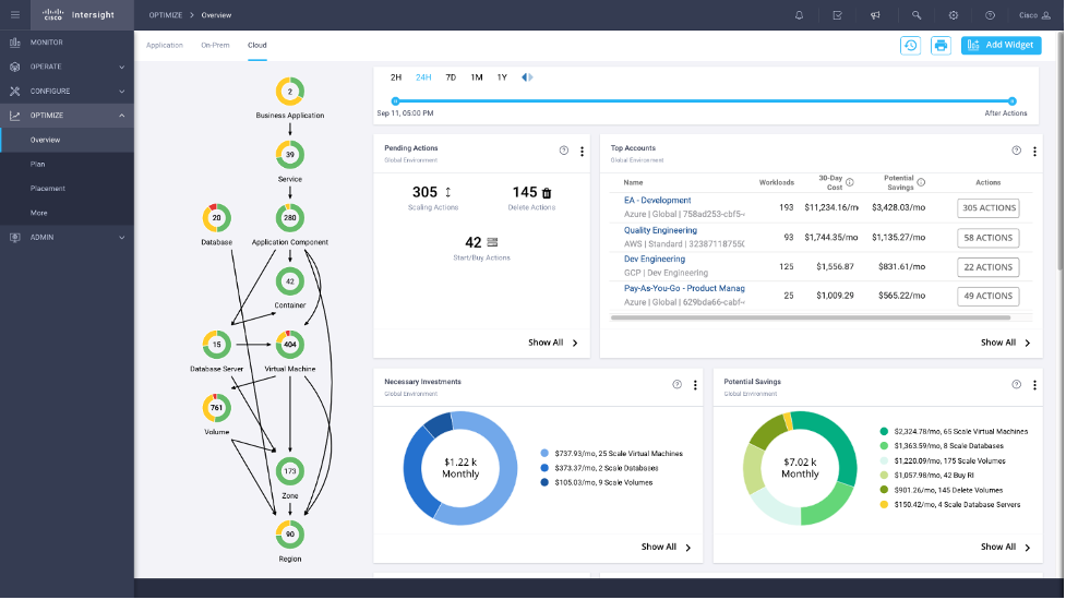 IWO continuously monitors data gathered from end points, applications, policies, etc., to make the best-informed decisions on workload placement and infrastructure sizing. Intersight Workload Optimizer’s real-time decision engine drives continuous health of your applications across on-premises, public cloud, and edge for virtualized and containerized environments.