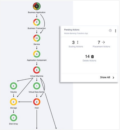 - Issues recommendations: Identifies potential issues that could impact application performance and recommends actions to take to avoid issues before they happen (provisioning, move, delete, scale, resize, buy, and stop actions), or how to remediate if issues do occur.