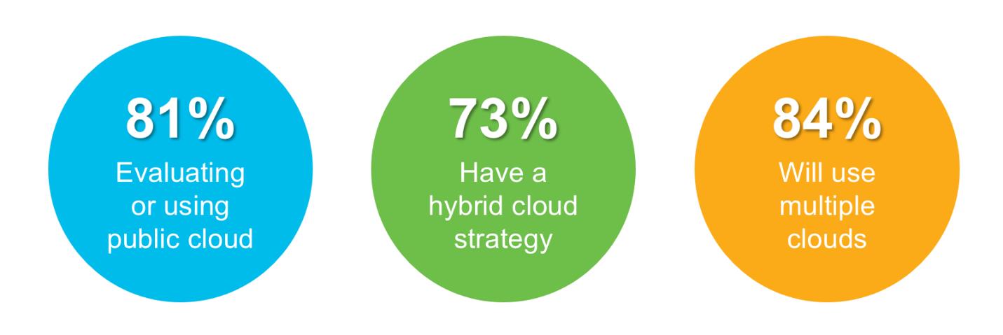 - 84% will use multiple clouds. Many subscribe to multiple external cloud providers and run workloads using a mix of public/private cloud and dedicated IT capabilities. They want to be able to choose from multiple cloud providers based on location, policies, and governance needs.