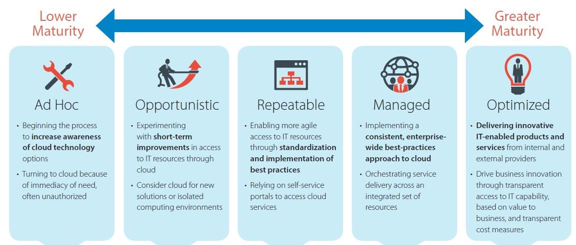 IDC has profiled several organizations around the world and has come up to a conclusion that there are 5 maturity levels with regards to cloud adoption: