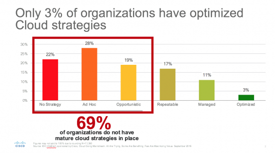 So even if you know where you want to go (aka your cloud strategy) that is only the beginning. According to research conducted by IDC with over 11,000 IT professionals, only 3% of organizations have optimized cloud strategies! Yes, 3%. And even more surprising (or shocking) 69% of organizations do not have mature cloud strategies in place.
