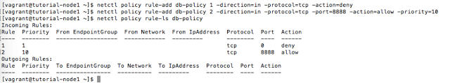 The policy named db-policy (defining, in this case, what ports are open and closed) is now applied to all the 3 containers: managing many end points as a single object makes it easy and fast, just think about auto-scaling (especially when integrated with Swarm, Kubernetes, etc.).