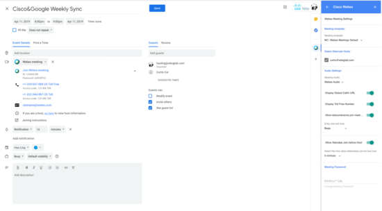 What’s made the existing app so popular is the seamless set up for IT with no desktop installation and no upgrade management required. For end users, they love the convenience of an integrated scheduling experience without having to open up a separate tool or browser. With the new Add-ons framework, we will extend this experience to bring additional Webex meeting settings right inside the Google Calendar interface. This will enable hosts to: