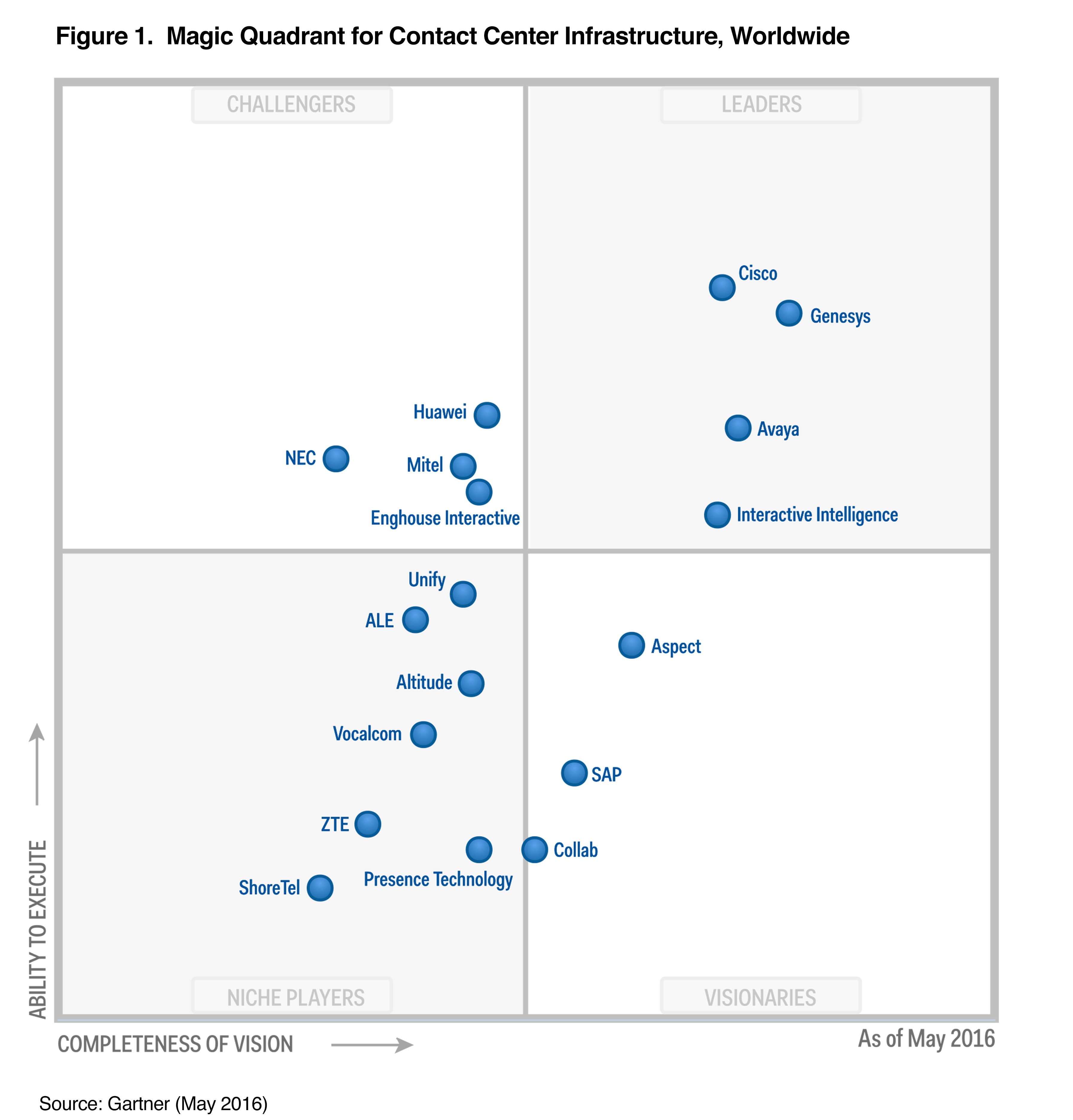 Gartner bases Ability to Execute on several criteria, including the breadth, quality, and overall maturity of vendors’ applications; their customer support capabilities; and their ability to deliver solutions that enable contact center operations in the formal contact centers of midsize or large enterprises.