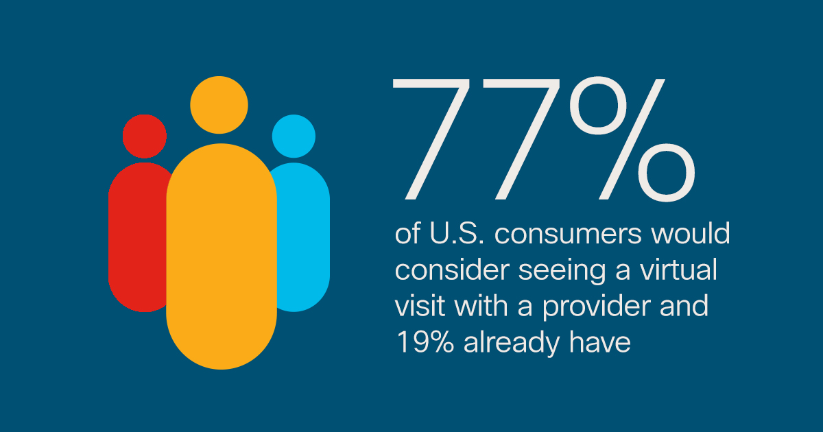 Up to 77% of U.S. consumers would consider a virtual visit with a healthcare provider—and 19% already have—according to a survey from The Advisory Board Company.