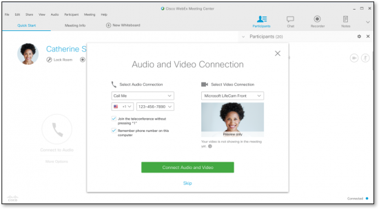 How does it work? Just preset your audio and video preferences (whether dial in, call back, call back to a video endpoint, or connect your webcam), and click the big green button to connect to the meeting with audio and video. Do that once, and the WebEx client will remember your previous selections.
