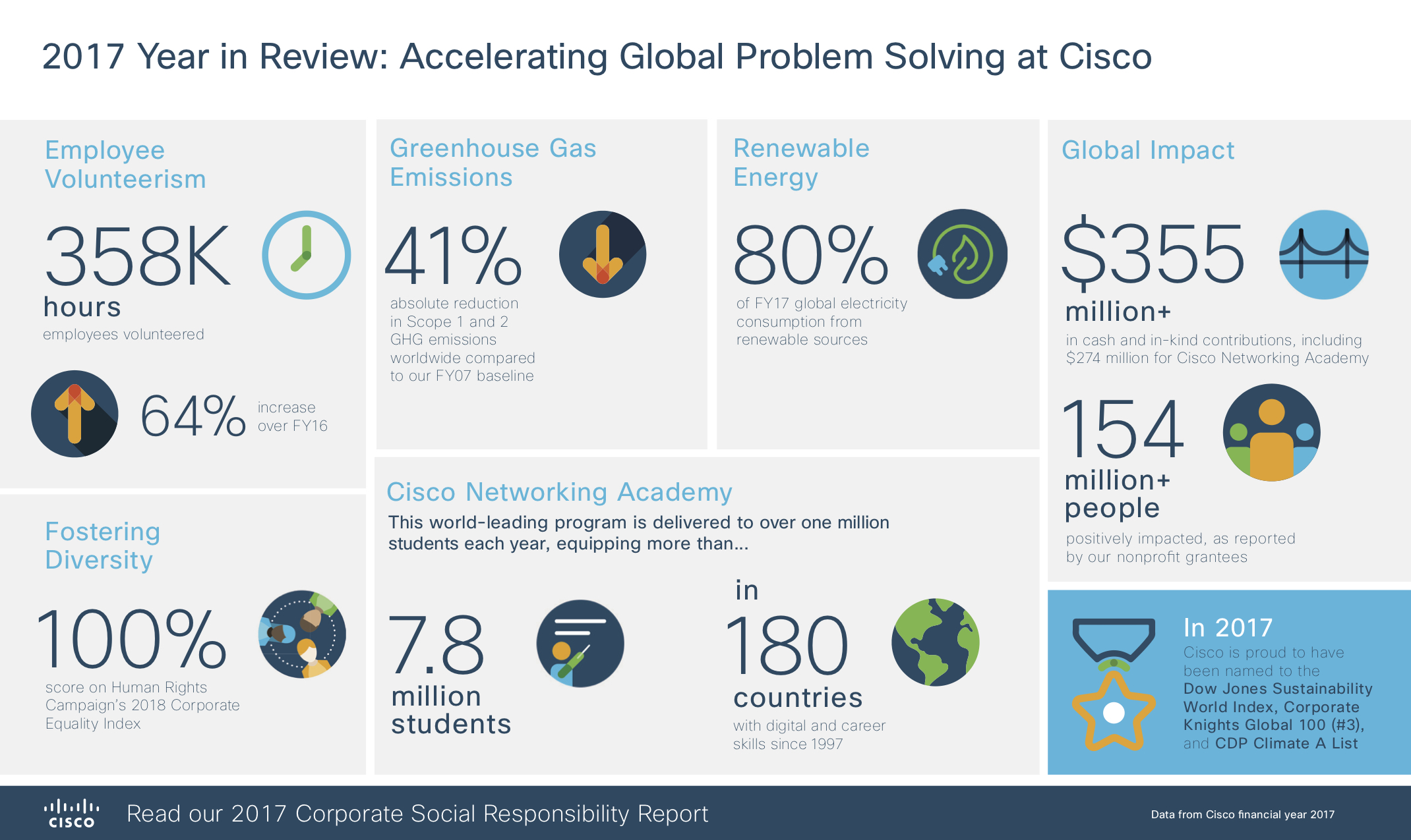 To learn more about the progress we’re making to positively impact people, society, and the planet, read our 2017 CSR report and share your favorite parts on Twitter (@CiscoCSR) and Facebook. You can learn more about our CSR programs and strategy by visiting https://www.cisco.com/c/en/us/about/csr.html.