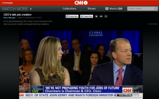 The complete interview of John Chambers at the Clinton Global Initiative Annual Meeting that aired on CNN can be found on these two videos: