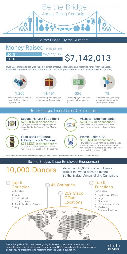 The result: Over 10,000 employees in 45 countries participated, generating $7.1 million dollars in direct employee donations and matching funds from the Cisco Foundation for 1,200 community partners. This is a 56 percent increase over 2015’s collective $4.5 million dollars in direct employee donations and matching funds.