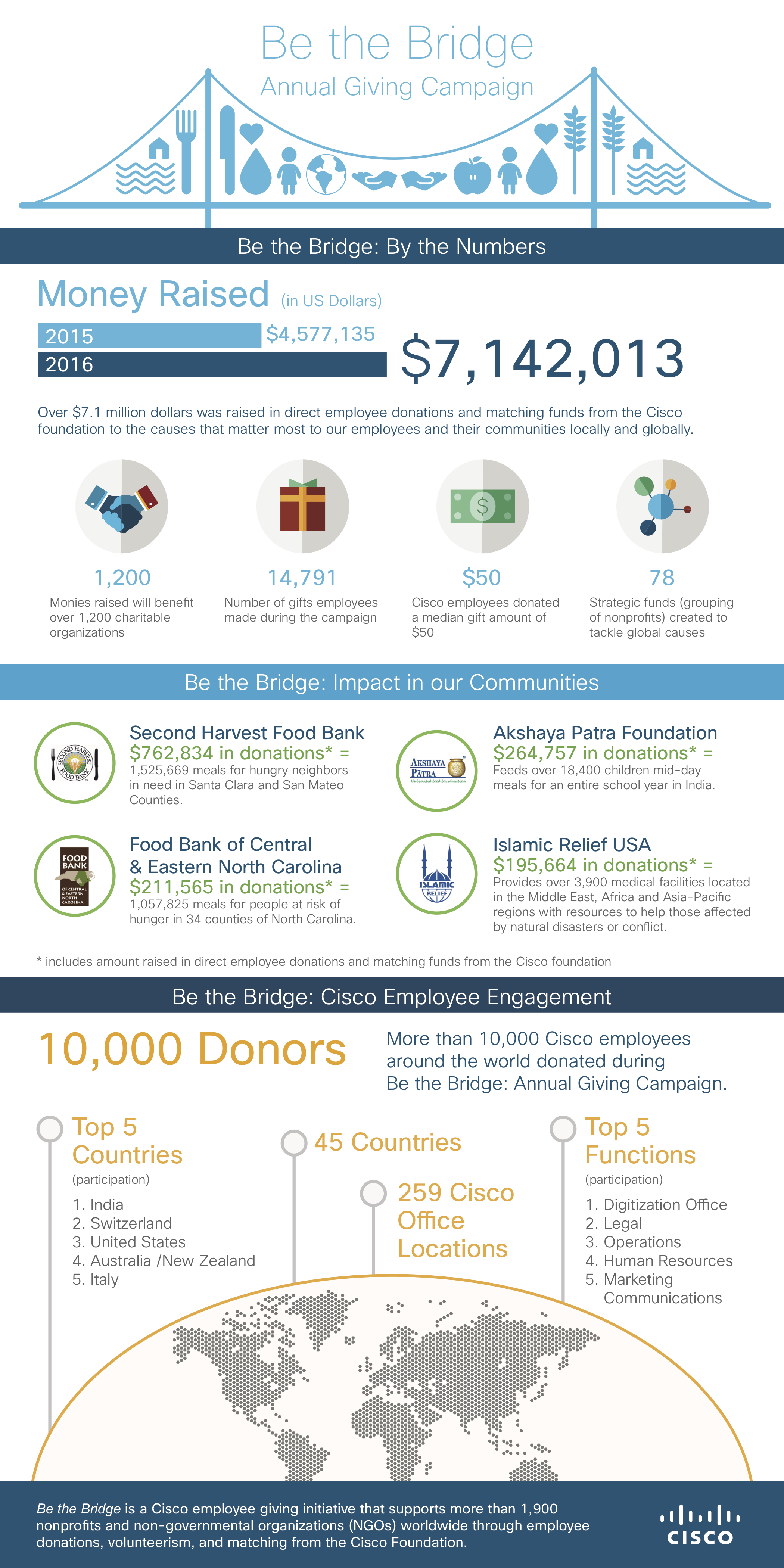 For the second year in a row, our Be the Bridge Campaign was a gravity-defying experience for Cisco employees worldwide. Together, they acted as global problem solvers and supported the Annual Giving Campaign by raising millions in donations, volunteerism, and matching from the Cisco Foundation.
