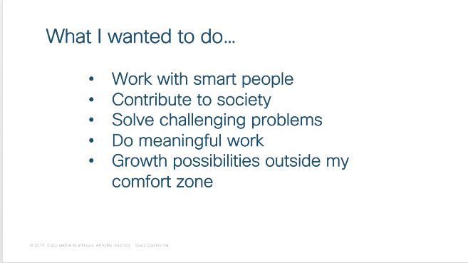 If I look at my goals and my current role, I can safely say that I have been moving in the right direction. At Cisco I have the privilege to work with incredible talent on cutting-edge innovation that it is helping improve people’s lives and access to education.