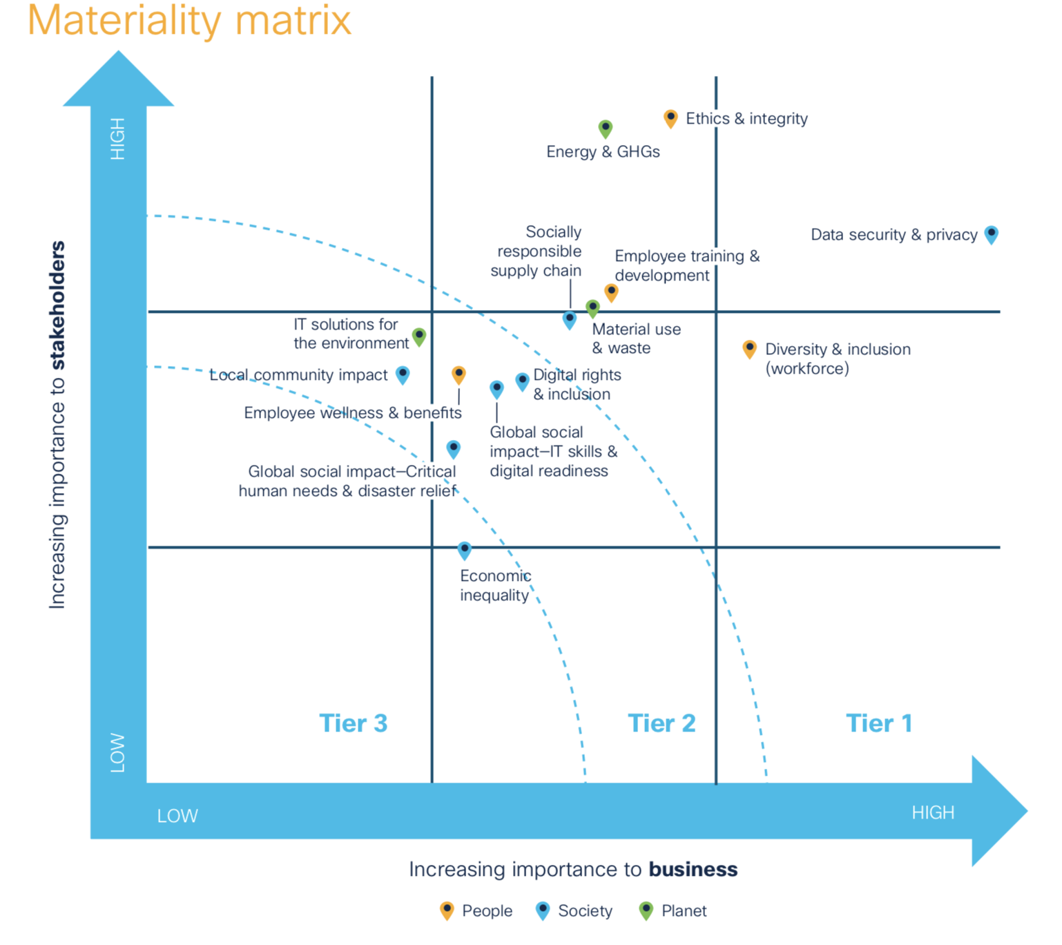 An important input to report content and CSR strategy is a materiality assessment. The assessment helps us understand what issues are most important to stakeholders inside and outside Cisco. We conduct a full assessment every two years. In years that we do not conduct a full assessment, we do an internal materiality refresh. This helps us validate priorities relative to business risks and opportunities. Each year, we provide results to the Cisco Governance, Risk, and Controls team, which feeds into Cisco’s ERM program.