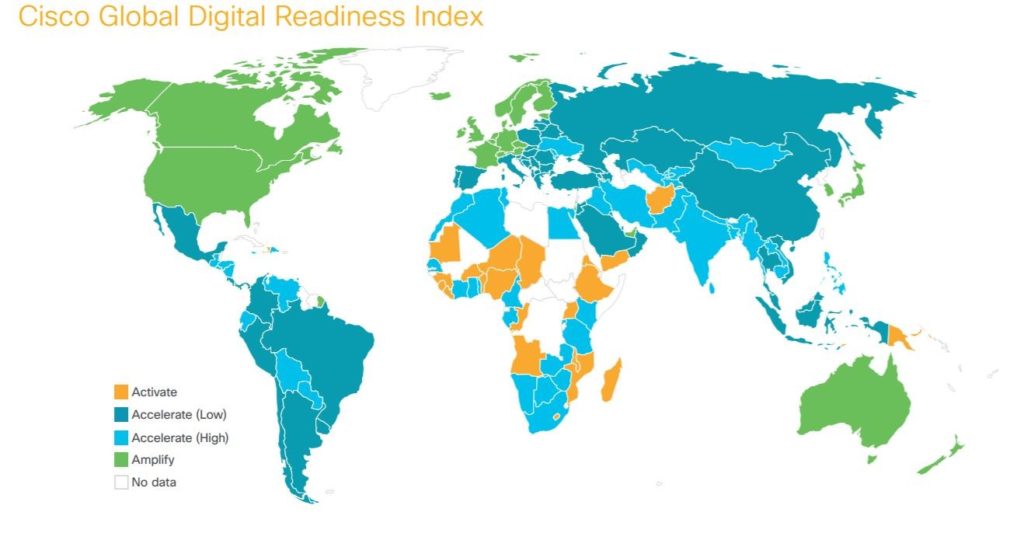Cisco Global Digital Readiness Index Digital Readiness scores reveal which countries are most digitally ready and which are less so, presenting opportunities for local government, industry, educational institutions, and community organizations to work together to help create an inclusive digital economy. The framework to measure digital readiness can also be applied to examine the level of digital readiness of states, territories, regions, and/or provinces within a country. In February 2018, the framework was applied to Australian states and territories. Key government and policymakers used the results to inform investment across the states. The findings were shared to help maximize digital inclusion and show how Australia can move further toward becoming a more digitally inclusive society.