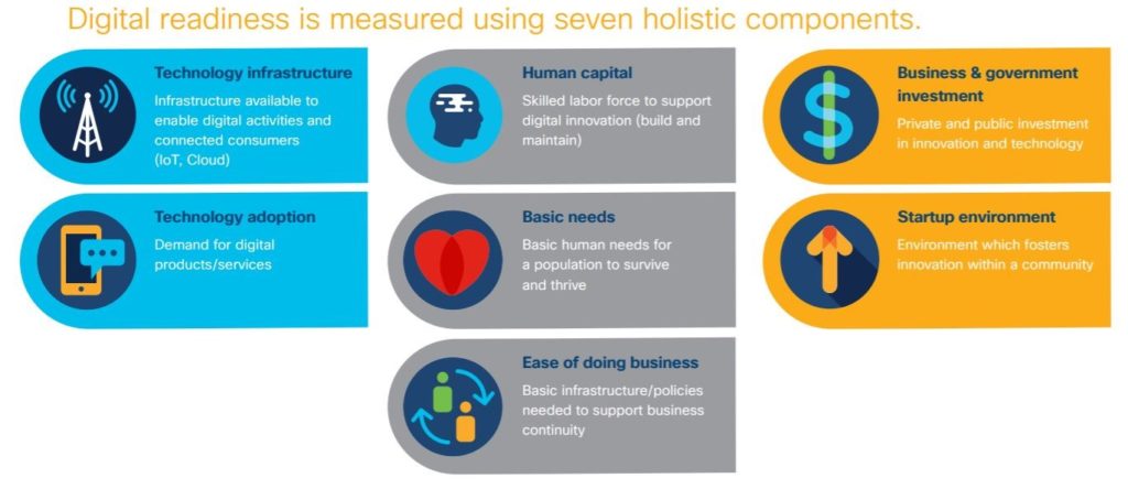 The model measures digital readiness on the basis of seven components: technology infrastructure, technology adoption, human capital, basic needs, ease of doing business, business and government investment and environment for startups.