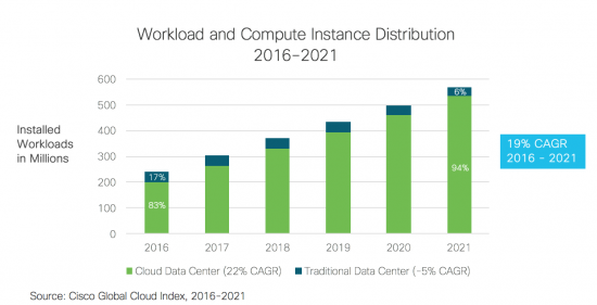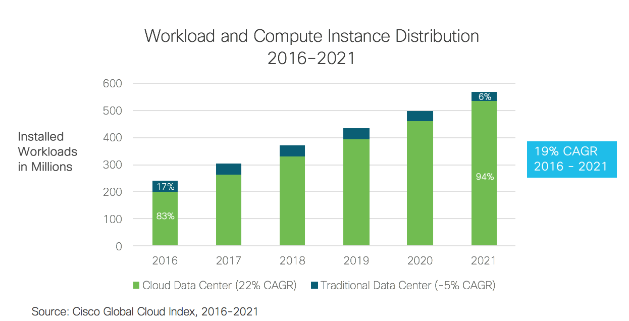 The recently released Cisco Global Cloud Index study predicts that by 2021, 94 percent of all workloads and compute instances will be processed in the cloud. Public cloud is expected to grow faster than private cloud and by 2021 the majority share of workloads and compute instances will live in the cloud. Many organizations are expected to adopt a hybrid approach to cloud as they transition some workloads and compute instances from internally managed private clouds to externally managed public clouds.