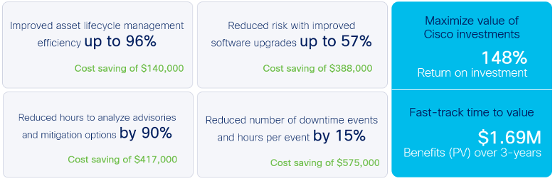Decision-makers who participated in the TEI Study found significant ROI by leveraging Cisco Success Tracks. The results shown below highlight quantified ROI and cost savings.