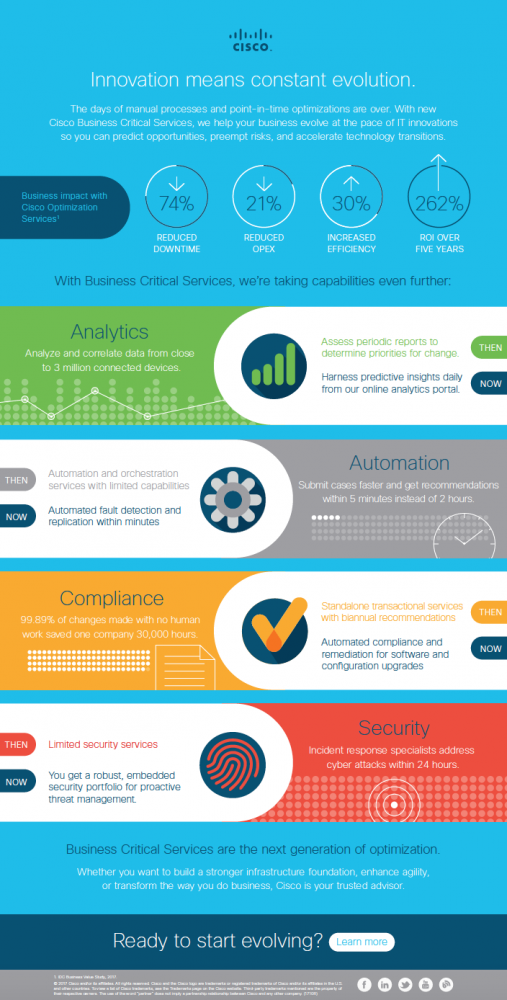 There is no perfect formula for success, but we’re getting close with the launch of Cisco Business Critical Services. I am proud to share Cisco Services’ debut of our portfolio of next-generation optimization services that apply analytics, automation, and technology expertise to help our customers predict opportunities, preempt risks, and navigate technology transitions.