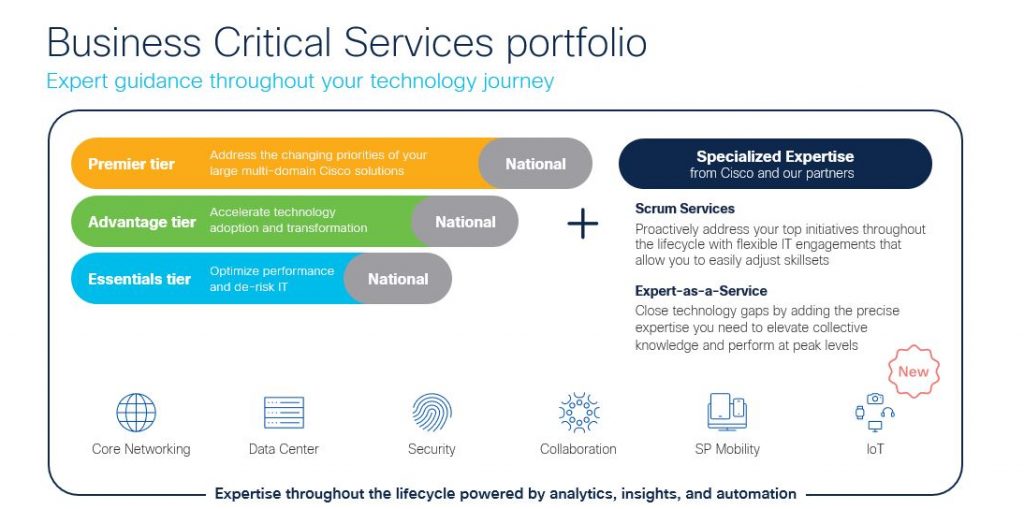 We’re also announcing coverage for a new architecture. In addition to supporting core networking, data center, security, collaboration, and SP Mobility architectures and technologies, Business Critical Services will now support IoT as a sixth architecture.