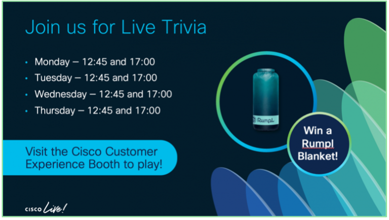 Live Trivia will be held at 12:45 p.m. and 17:00 p.m. Monday, February 10, through Thursday, February 13. You’ll have the opportunity to take home a Rumpl Blanket and show off your knowledge of Cisco Customer Experience. Of course, you can attend our demos and sessions to learn more about Cisco Customer Experience and increase your chances of winning.