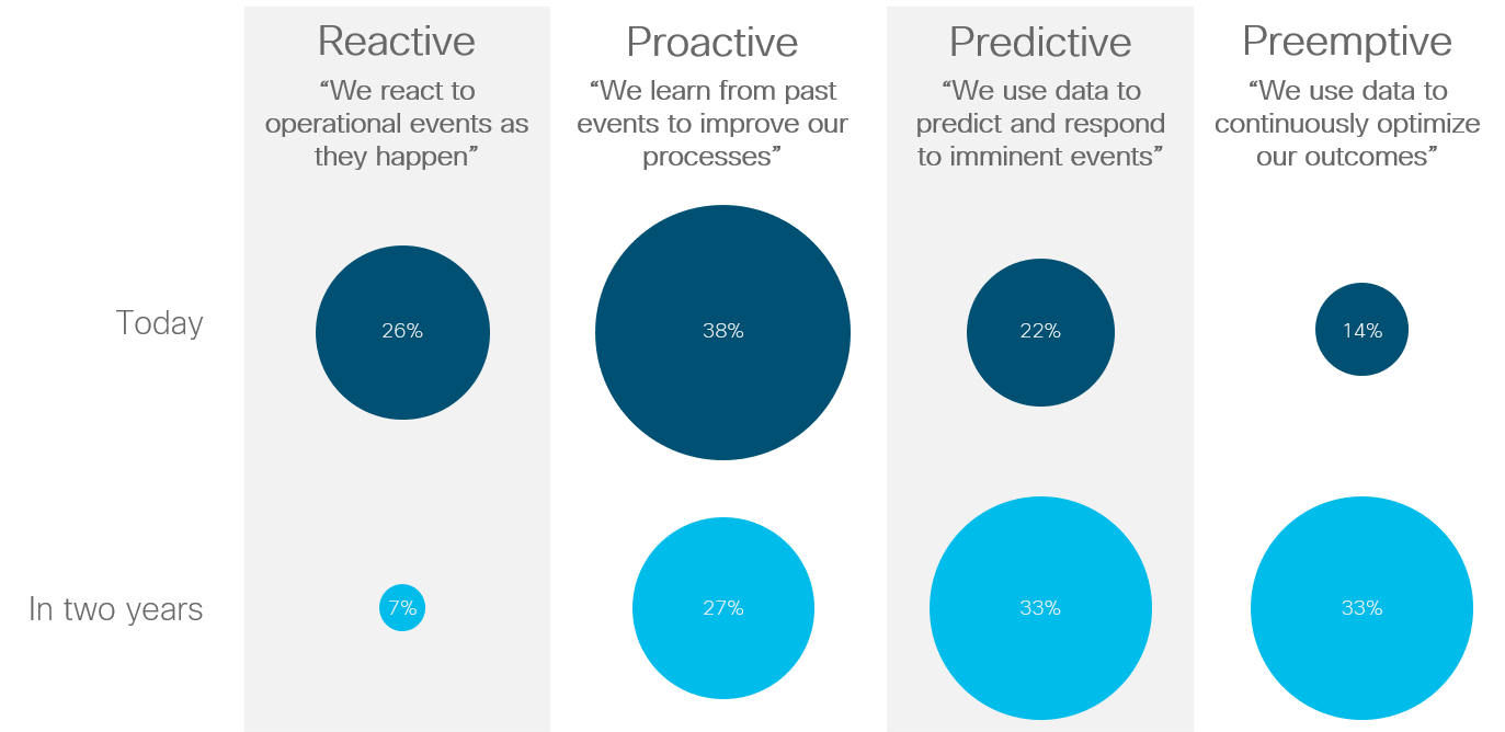 Today, only 14 percent of organizations are at the highest level: preemptive. In just two years, though, 33 percent expect to be at the highest level of the model. That’s excellent news, and more evidence that things are going to continue to move in only one way—fast.