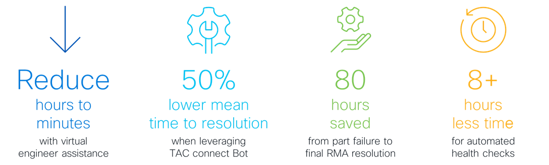Another tool we offer is the self-service TAC Connect Bot, which lets you see your case status and interact with Cisco digitally for more common use cases. This Cisco innovation also provides proactive alerts, such as known critical problems, tool updates, and related articles. Because we have automated the “easy stuff,” our engineers have more time to focus on complex issues, which results in time savings for you, too. In fact, our customers have saved more than 30,000 hours since the launch of the TAC Connect Bot, just through access to on-demand case statuses.