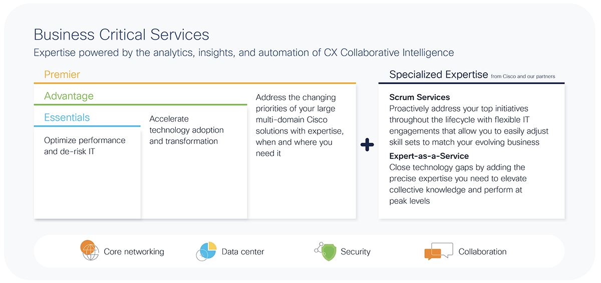With our Essentials, Advantage, and Premier pre-packaged tiers, you gain access to the expertise you need – at every step of your Cisco lifecycle journey. Our Specialized Expertise (Scrum Services and Expert-as-a-Service) provide targeted guidance from dedicated experts to help you build an adaptive workforce.