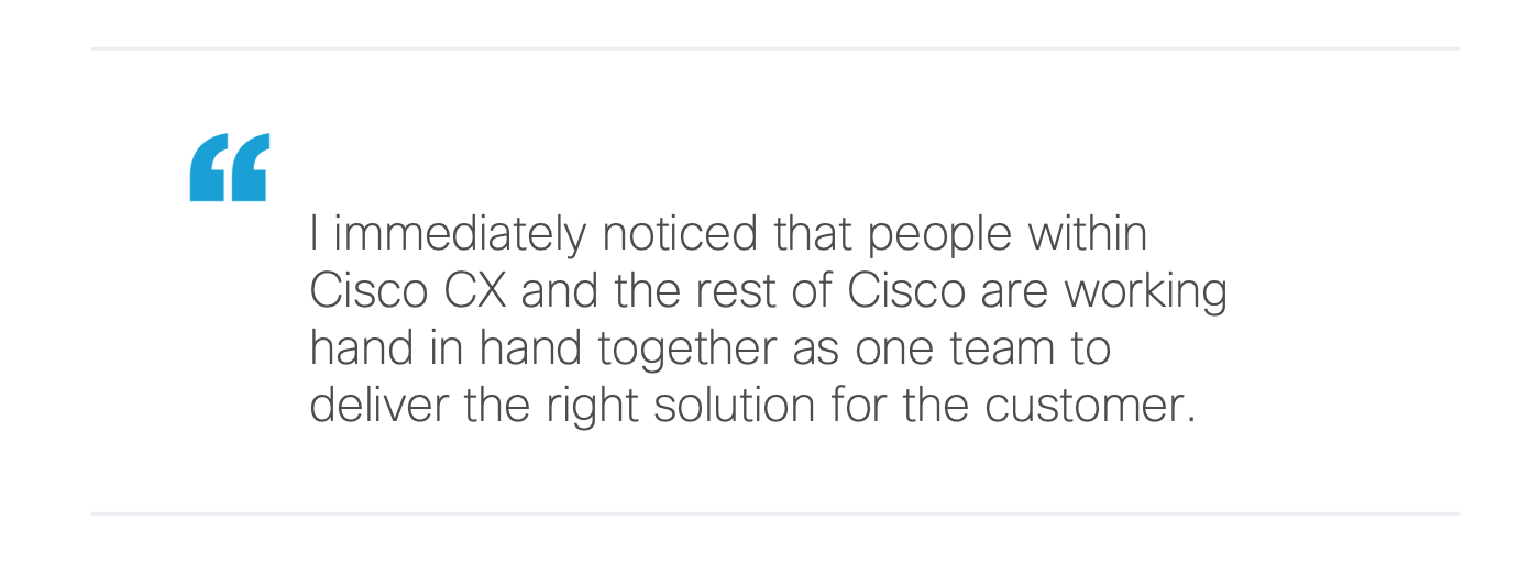 Aseel joined Cisco as a Network Consulting Engineer, in the SD-WAN teamAs an NCE, she’s responsible for designing, testing and implementing SD-WAN solutions for customers — putting her on the cutting edge of real-world networking. The approach to getting the job done struck her instantly. I immediately noticed that people within Cisco CX and the rest of Cisco are Working hand in hand together as one team to deliver the right solution for the customer.“For example, you could have a Webex call with a customer or a partner and you would have a TAC engineer, product managers from Cisco engineering, and Network Consulting Engineers like me, we’re all working to help the customer. There are no siloes here.
