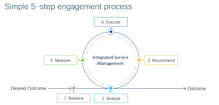 At the beginning of the engagement, together with you, we identify outcomes aligned KPIs (Key Performance Indicators). Next, we use our automated KPI measurement tools and telemetry to create a baseline. Throughout the engagement, Cisco experts track, measure, translate, and report the impact aligned with your desired outcomes.