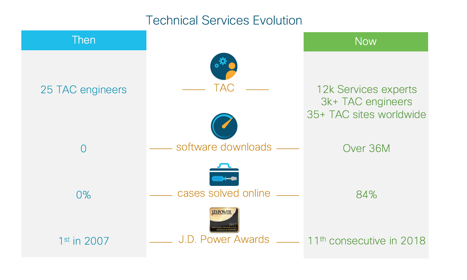 Just as car manufacturers continue to improve their models every year, Cisco Services continues to innovate. In the old days, technical support meant shipping you a new “box” of equipment when your old one broke. Traditional product support is no longer enough. Today, it’s about supporting complete, multi-vendor solutions and achieving desired customer outcomes.