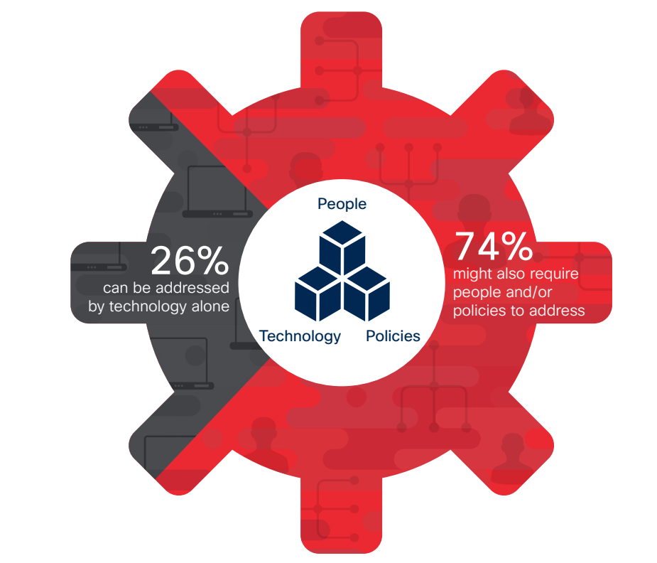 In fact, according to Red Teaming attack simulations conducted by the Cisco Security Services Advisory Team security technology products alone could thwart only 26 percent of the known issues. Using security policies alone, this number dips to 10 percent. And even with the most highly trained people on-hand, only 4 percent of the issues would have been remediated.