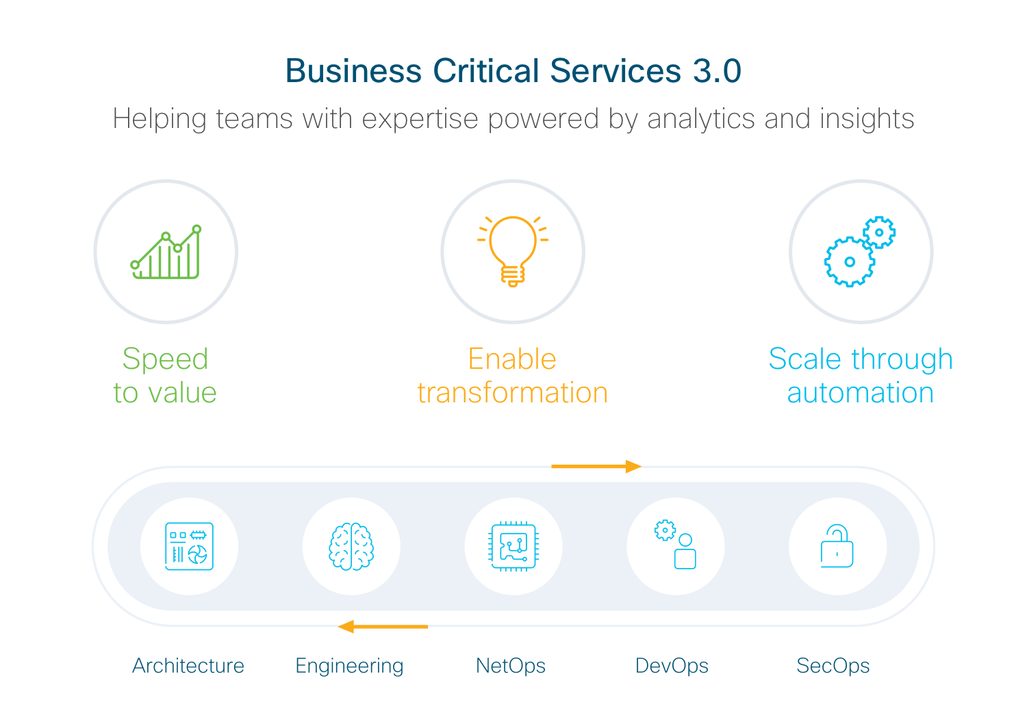Business Critical Services gives your architecture, engineering and operations teams instant access to infrastructure platform insights through the Business Critical Insights Portal. We’re introducing new functions for DevOps, SecOps and NetOps, plus targeted help from Cisco experts during key lifecycle events, such as change window support, incident management, and strategy and design reviews.