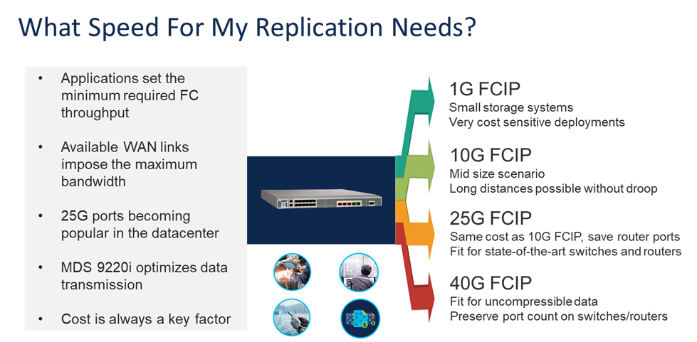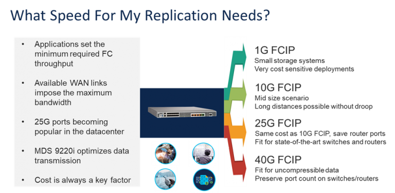 Mid-size storage arrays typically connect to FCIP switches for their remote data replication needs. New trends in datacenter networking, and uncertainties on the data-dependent compression ratio, are clearly suggesting that 25G FCIP is the best approach to address those needs. So look no further: Cisco MDS 9220i is what you need for your high-performance and secure SAN extension projects.