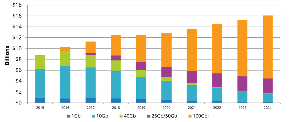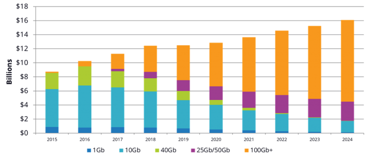 According to a report from IDC on Datacenter Ethernet switch revenue by speed, in the period 2015-2024 it is clearly visible a downtrend for 1/10/40G ports and a rise for 25/100G ports. In 2022 alone, 25G ports revenue will exceed the same for 10G ports. It can also be noted that matching 100G ports with 4x breakout capabilities leads to ample availability of 25G connectivity.