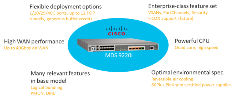 To cope with those trends, a modern FCIP SAN extension device should have support for 25G speed. Possibly, this is the most noticeable indication that the product was designed to accommodate present and future requirements. Cisco MDS 9220i FCIP switch is the leading offering when it comes to addressing remote data replication needs. It enables customers to implement high-performance SAN extension solutions, cost-effective multiprotocol connectivity, and distributed intelligent fabric services for both open systems and mainframe environments (FICON qualification pending). Its 32G FC ports enable high-speed connectivity to the storage array replication ports. With a compact form factor of just 1RU and its set of advanced SAN extension capabilities, the Cisco MDS 9220i is an ideal solution for departmental and remote branch-office SANs as well as for large-scale Fibre Channel fabrics in conjunction with Cisco MDS 9700 Series Multilayer Directors.